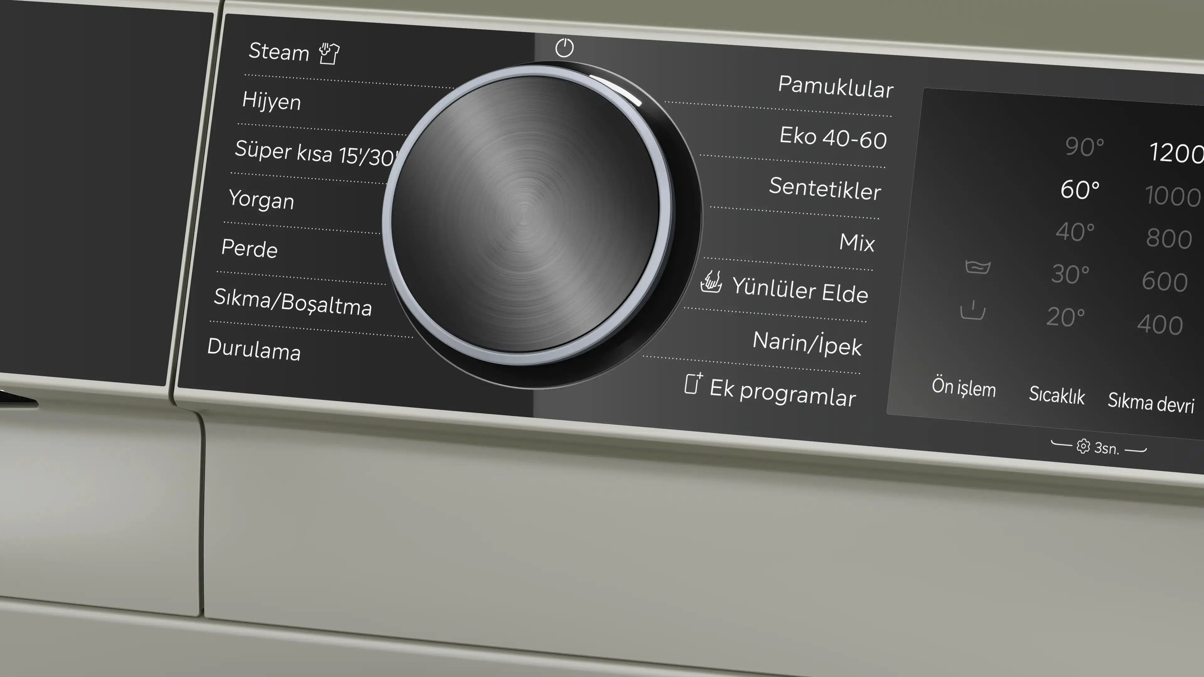 Hijyen, Steam, Perde, Sıkma-Boşaltma, Mix, Durulama, Yorgan, Süper kısa 15'/30', Kırışıklık önleme, Kalan süre erteleme, Başlat/Beklet tuşu, Sıcaklık seçimi, varioSpeed, Devir sayısı seçimi