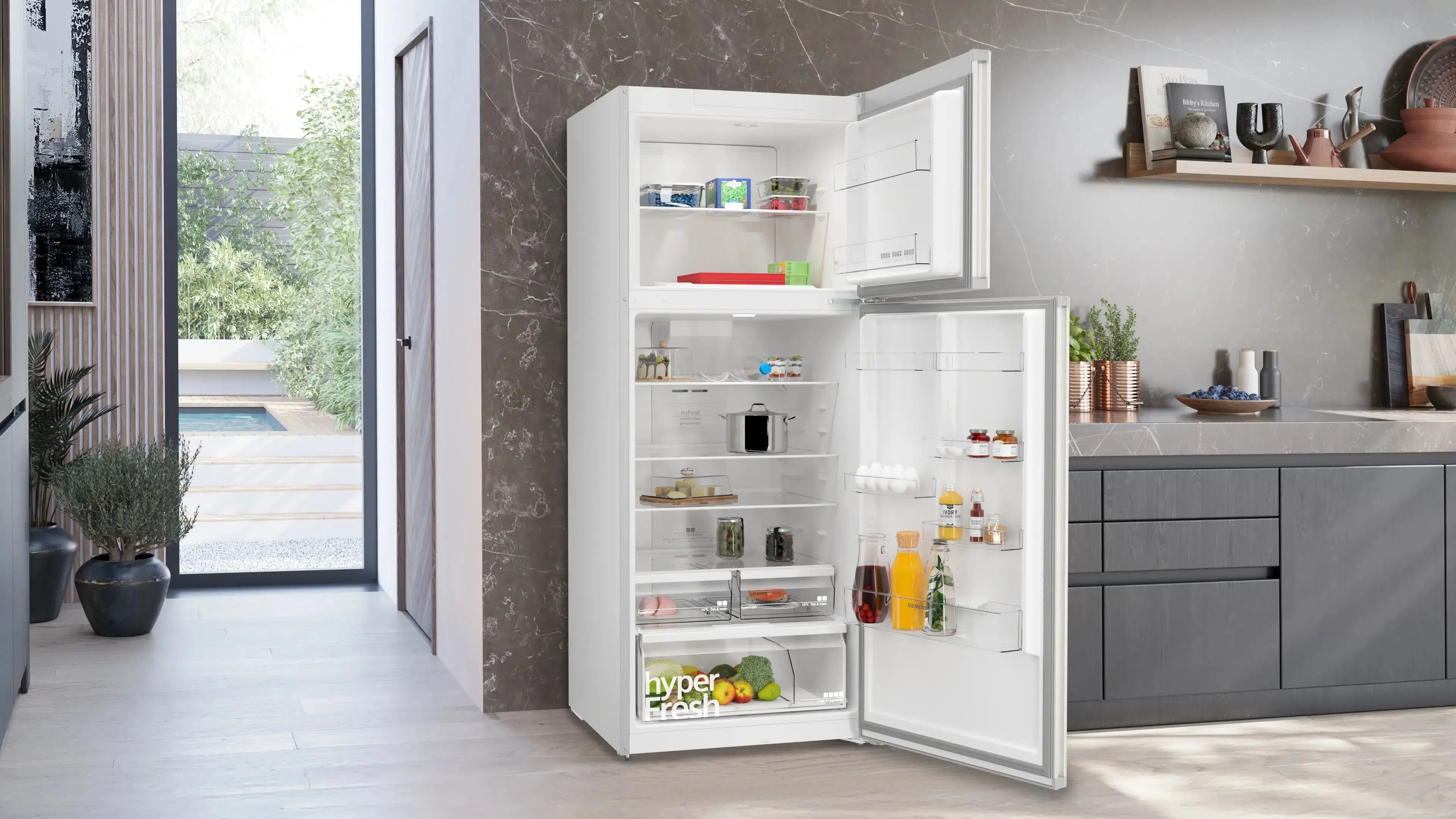 Ayarlanabilir nem kontrol mekanizmasına sahip sürgülü hyperFresh plus çekmecesi sayesinde meyve ve sebzeler en uygun nem oranında 2 katına kadar daha uzun süre taze kalırlar.